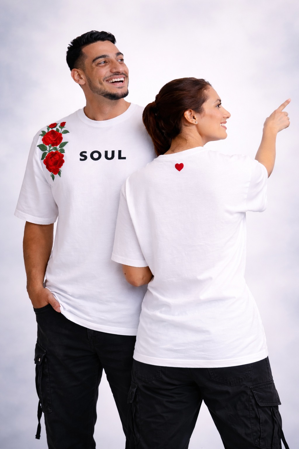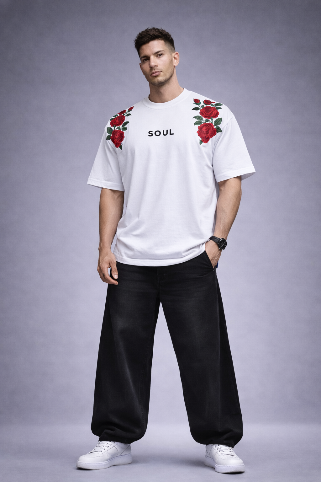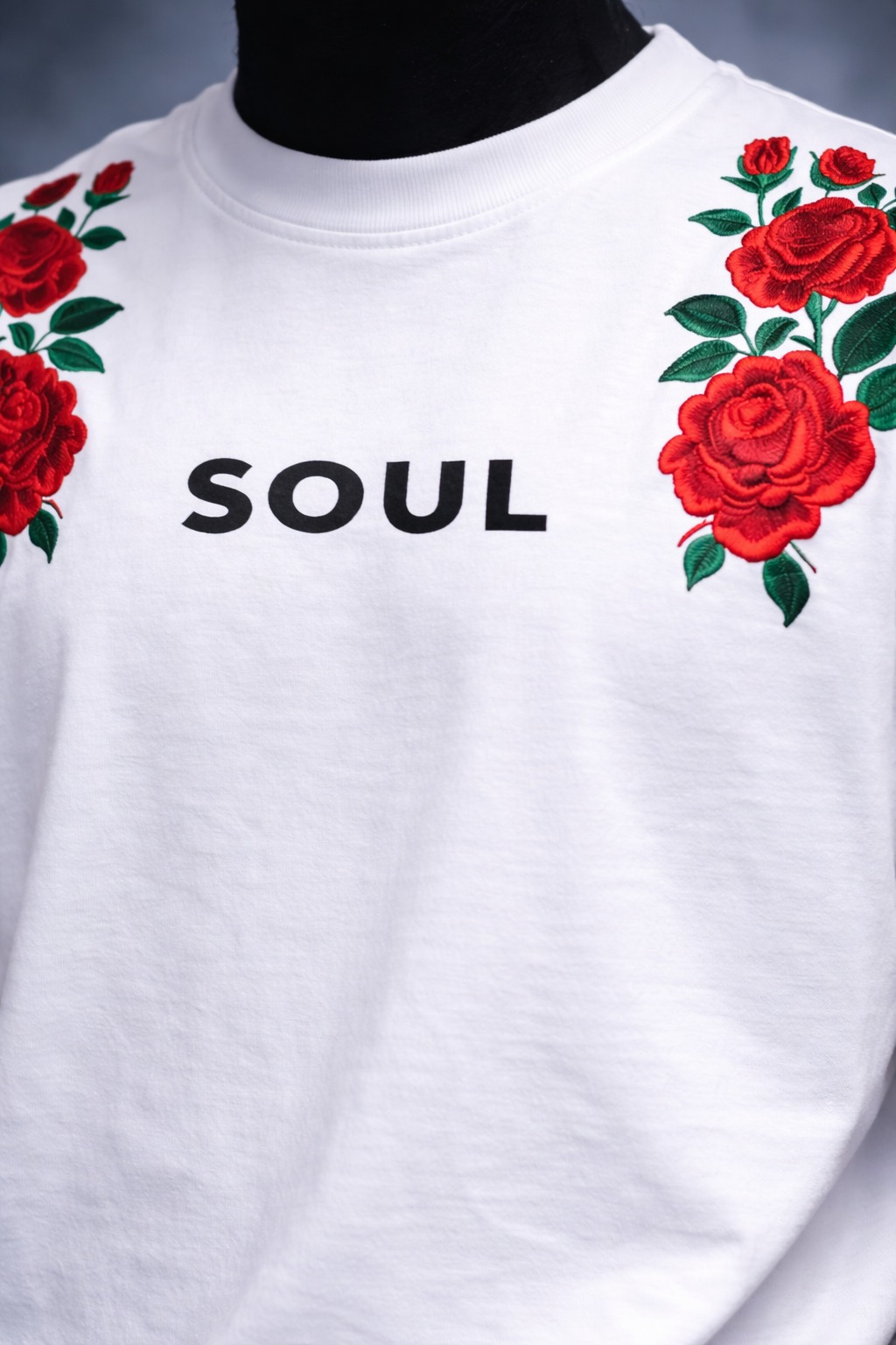 Set against a clean ivory-white canvas, the design speaks through restraint. White represents clarity of mind and steadiness of spirit — a foundation untouched by noise. Across the shoulders, twin rose clusters bloom with intention. They are not decorative. They are symbolic.